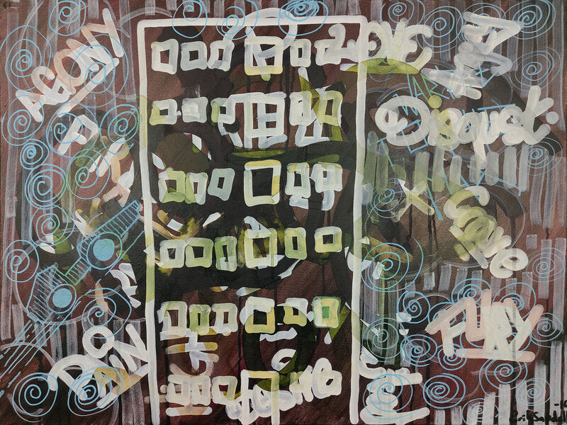 Målningen är skapad på en bomullscanvas, designad för att hängas horisontellt. Den mäter 80 x 60 cm (31,5 x 23,6 tum) och är gjord med en blandad medieteknik, som kombinerar akrylfärg och permanenta markörer. Den avslutas sedan med lack för att ge en hållbar, icke-gulnande försegling, vilket säkerställer skyddet och långvarigheten av detta unika konstverk. Det är ett signerat, unikt originalkonstverk, målat på kanterna, mestadels svart.